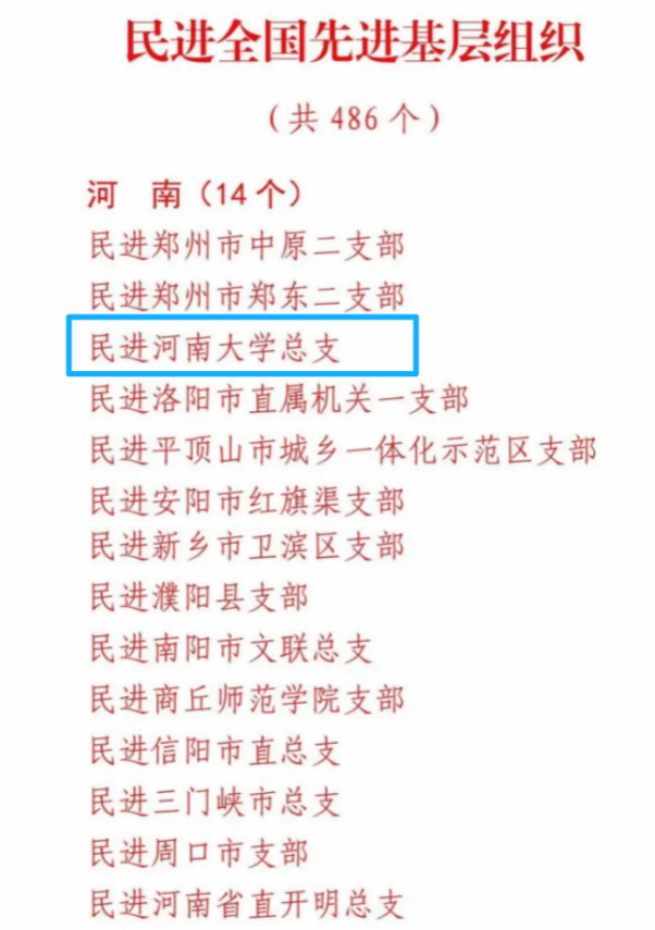 近日,在庆祝中国民主促进会成立80周年之际,为表彰先进、树立典型,鼓舞和激励民进各级组织和广大会员奋勇争先、再建新功,民进中央委员会表彰了一批先进组织和会员,中国民主促进会河南大学总支部委员会(以下简称“民进河南大学总支”)被授予“民进全国先进基层组织”称号。这一荣誉的取得,是对民进河南大学总支长期以来在思想政治建设、参政议政、社会服务等方面作出突出贡献的充分肯定。
