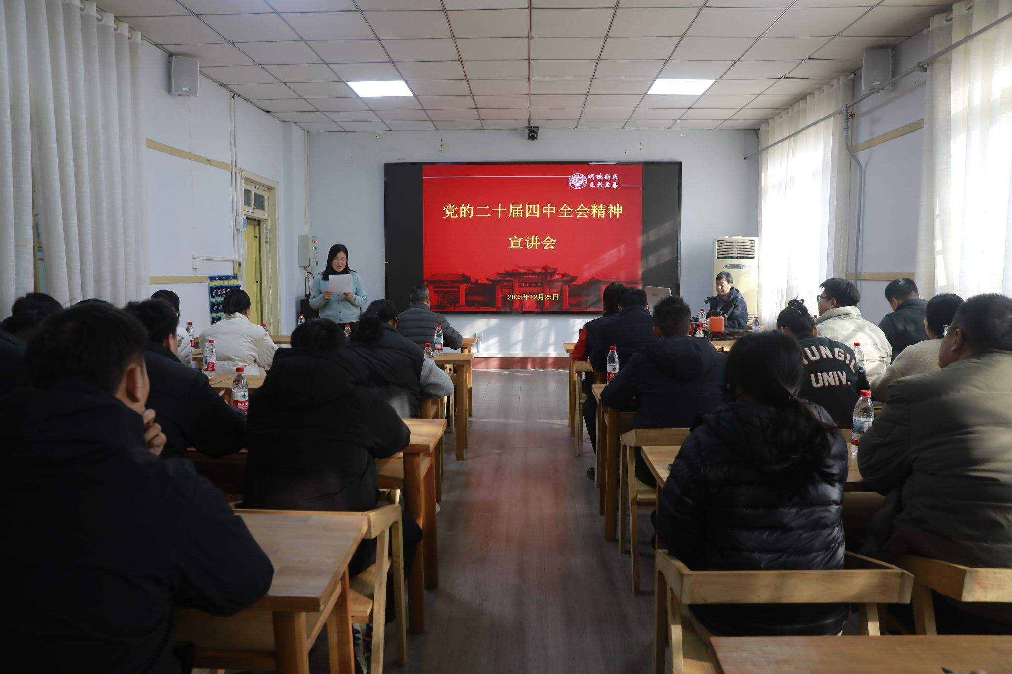 为深入学习贯彻党的二十届四中全会精神,引导全院教职工、党员深刻领会会议核心要义与实践要求,切实把思想和行动统一到党中央决策部署上来,12月25日下午,武术学院特邀河南省优秀教师、思想政治教育学科带头人、马克思主义学院欧健教授,在学院二楼会议室作党的二十届四中全会精神宣讲报告。武术学院全体教职工、学生正式党员参加会议,宣讲会由武术学院党委副书记仝兆静主持。