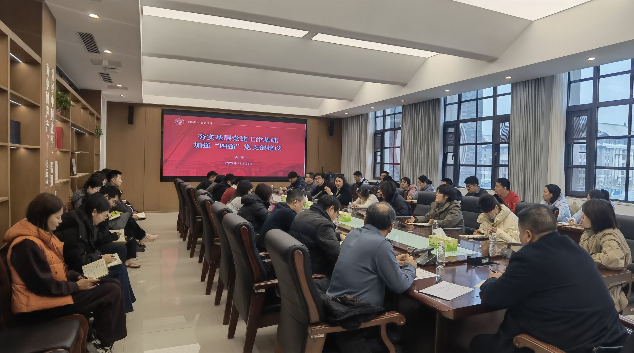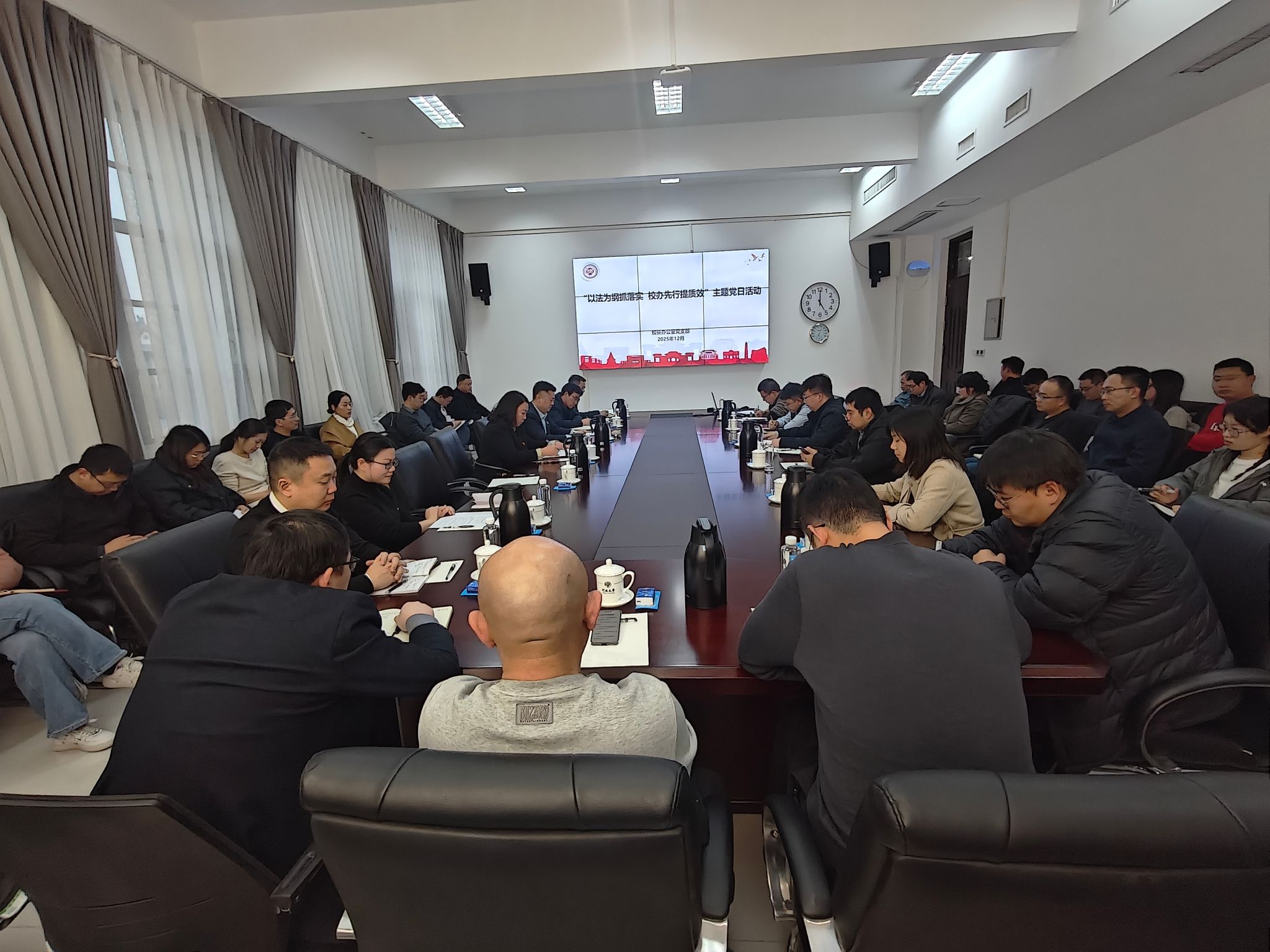 授课结束后,培训班学员来到友兰学堂中楼301会议室,校长办公室党支部在此开展“以法为纲抓落实,校办先行提质效”主题党日活动,学员们进行了现场观摩学习。