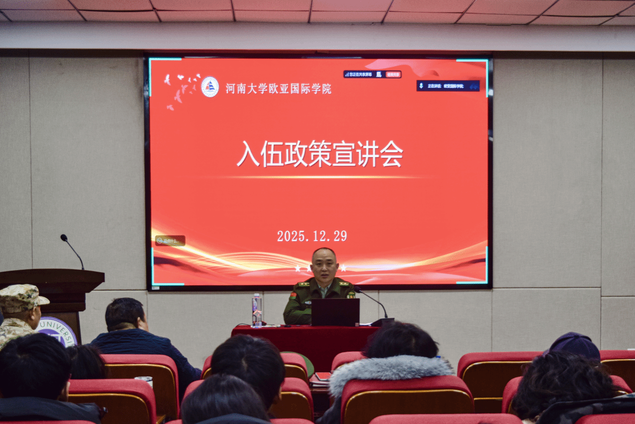 为持续推进大学生征兵工作常态化开展,进一步提升征兵政策宣传的针对性和实效性,12月29日下午,欧亚国际学院在二楼报告厅举办2026年春季大学生入伍政策宣讲会。活动由学院党委副书记贺颖主持,顺河回族区人民武装部副部长徐平、河南大学保卫处军事理论教育科科长文晶受邀作专题宣讲。