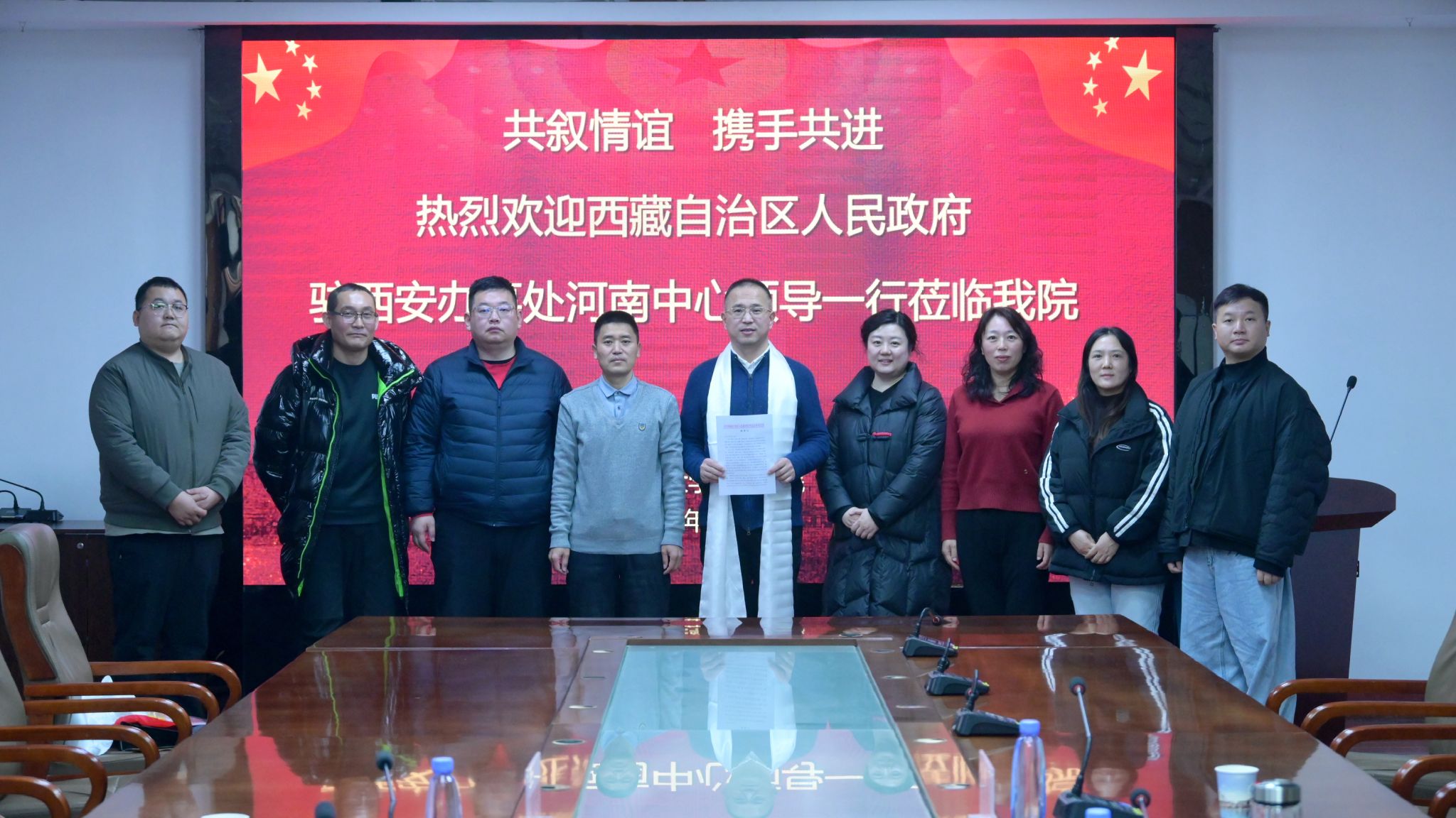 2月10日,西藏自治区人民政府驻西安办事处河南中心二级调研员赵勇一行专程到访淮河医院,送上感谢信与洁白哈达,对医院长期以来为在豫西藏离退休人员、干部职工及家属提供的优质医疗服务表示诚挚谢意。淮河医院院长、党委副书记、第二临床医学院(淮河医院)院长左克强及相关职能部门负责人参加座谈交流。
