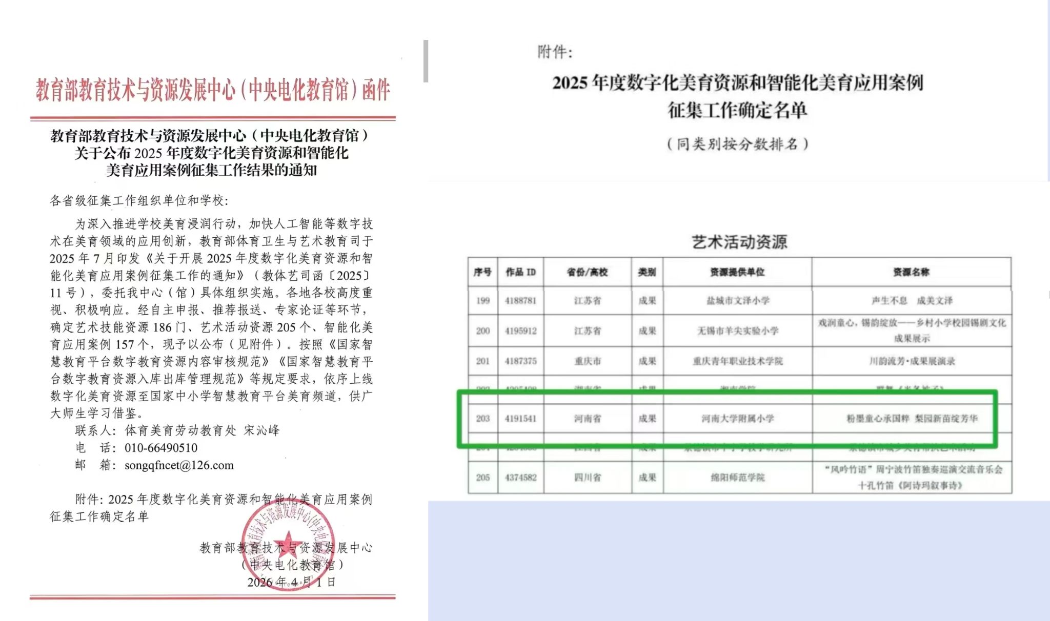 此次入选国家级美育案例,是对河南大学附属小学数字化美育工作的充分肯定。近年来,河南大学附属小学积极探索“数字化+美育”育人模式,从课堂数字教学到线上美育互动,从传统戏曲数字化呈现到智能沉浸式体验,逐步构建起课堂、校园、社会协同的美育工作体系。