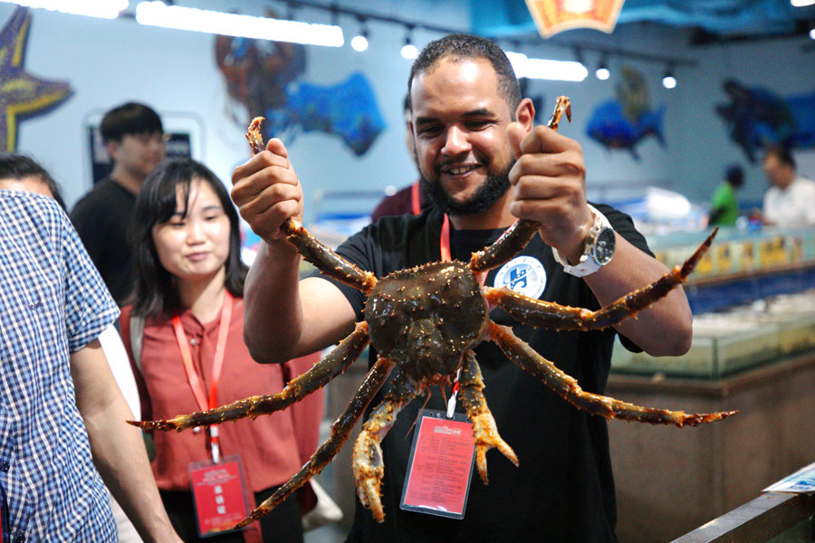 A foreign businessman chooses a crab at a seafood market in Zhengzhou, Henan province. [Photo/China Daily]