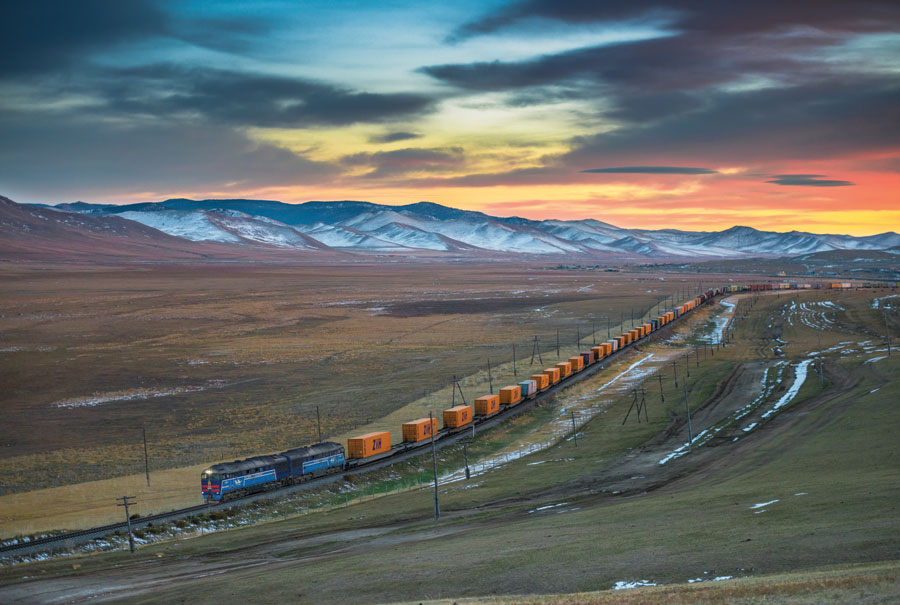A freight train of the Zhengzhou-Europe Express Railway travels across the Mongolian grassland. [Photo/China Daily]