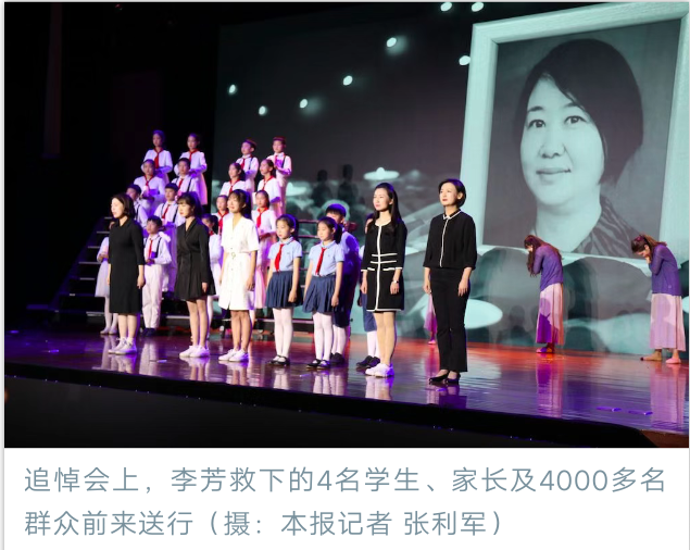 在李芳的追悼会上,4000余名群众从四面八方纷纷赶来,为她送行。其事迹被全国各大媒体、网站进行报道后,更是感动了无数国人。