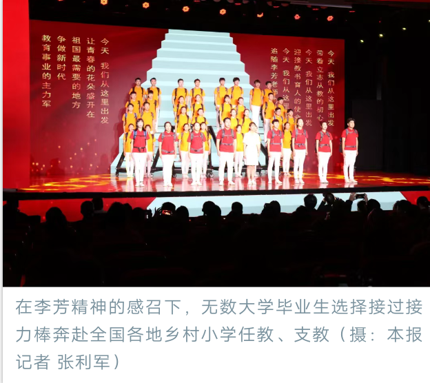 一瞬间很短,却在李芳身上变成了永恒,化作了夜空中最亮的星。英雄已逝,精神长存。一群青年人在李芳精神的感召下,接过李芳手中的接力棒,带着立志从教的初心和使命,奔赴各自的三尺讲台。
