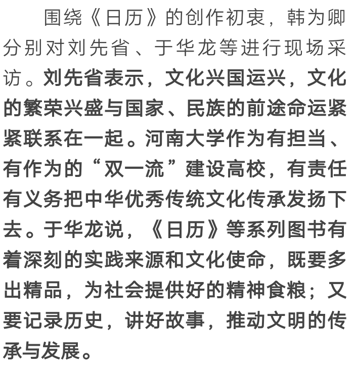 据悉,《日历》是全国高校首部日历书,图文精美,以百年历史、精美建筑、知名校友和校园风光等为线索,系统展示了河南大学百余年的赓续与风华,是学校宣传与文化建设的有益尝试。