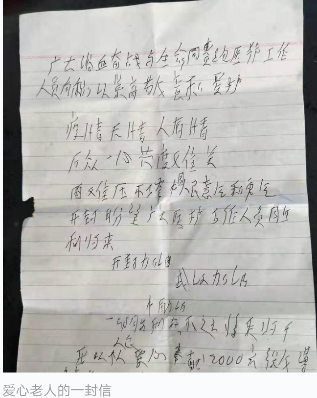 “我姓爱叫爱心,我是给你们淮河医院来送爱心的。”2月4日上午11点左右,在河南大学淮河医院门诊预检分诊台,一位穿着朴素、腿脚不便的老人,放下一个红包和一张纸,转身就走。当医院的工作人员追上来询问老人的名字时,他说了这么一句话。