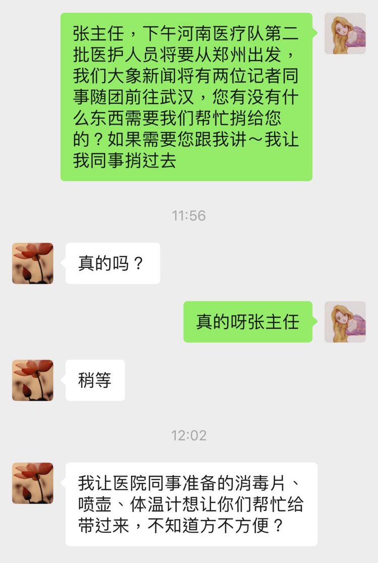 今天中午快12点的时候,我突然收到记者小朋友发来的消息:“张主任,下午河南医疗队第二批医护人员将要从郑州出发,我们大象新闻将有两位记者同事随团前往武汉,您有没有什么东西需要我们帮忙捎给您的?如果需要您跟我讲,我让我同事捎过去。”