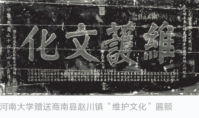 在位于古城开封的河南大学明伦校区校史馆,安放着一块巨大的牌匾,匾额正中,“维护文化”四个金色大字熠熠生辉,匾额下方,密密麻麻写了47个教职工的名字,每个名字前面,有职务和身份。此牌匾为复制品,原件在陕西省商南县十里坪镇黑沟村。两块牌匾的空间距离为518公里,时间跨度为67年,它们联结着河南大学和商南县赵川镇之间的校地情谊,记录了一段抗战期间的感人故事。