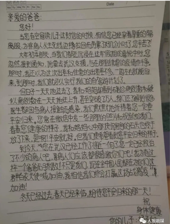 走向独立的过程,也往往是成长最快的过程。以前,杨子航觉得父亲总是忙,总是出差,陪自己的时间很少,心中不免有埋怨。远离父母的日子,他慢慢地体会到了父亲这份忙碌背后的责任与担当,因此,这个寒假他想着能多陪陪父母,于是,一家人就计划着春节假期里去自驾游。然而,新冠肺炎的肆虐打破了这个家庭的出行计划,也让整个中国按下了暂停键。病毒肆虐,医者当行!大年初二,父亲杨超火线得令,又一次踏上了“出差”的征程,这次是去武汉——这场疫情风暴的中心。和以往出差几乎没什么不同,忙完工作的父亲会和杨子航和妈妈视频聊聊天,拉拉家常,问问吃了什么,都干了些什么,提醒要多喝水,工作的事还是很少提及,只是突然对他的几株兰花更操心了,总是提醒别忘了浇水。可是疫情的发展还是出乎了这一家人的预料,原本以为最多两周的支援,如今已经过去了将近一个月。关于疫情的各种消息,以及对父亲的关心,让杨子航心中思念与担忧交织,只是视频中的父亲一如往常,甚至更平静了。2月23日,再过一天,就是自己的生日了。想到这名依然在武汉抗“疫”一线奋战的重症科医生;想到了这位给了自己生命,如今还在努力挽救更多人生命的男人;想到了这位沉默寡言,却给了自己如山父爱的父亲。“江水三千里,家书十五行。”毕竟子如父,对父亲杨超在视频和电话中说不出口的思念与关心,儿子杨子航以纸笔为媒倾诉,他给父亲杨超写下了一封家书:亲爱的爸爸:您好!当您有空阅读儿子这封信的时候,相信您已经穿着厚重的隔离服,为将病人从生死线边缘拉回而劳累了几个小时了。您辛苦了!大年初一那天,当我们都还沉浸在过年假期的喜悦中时,您忽然接到通知,说要去武汉支援,与在那里肆虐的疫情作斗争。那时,我还以为这次出差和往常的出差差不多,一周左右就能回来,到那时,我们就可以实行我们的自驾游计划了。但日子一天天地过去了,我和妈妈却到看到确诊病例数和疑似病例数在一天天地往上升,甚至突破了万人。我们还了解到很多医生都因与病人接触而感染,我们默默地祈祷着您一定要平安归来。您常在微信中发一些那里的照片和视频给我们,看着您健康的样子,我和妈妈心中那块沉甸甸的石头也终于放了下来,是啊!平安就好,但我们更希望看到您平安归来的样子。到今天,您在武汉已经工作了将近一个月了,您一定已经救治了不少的病人吧。病人们应该都很感激你们吧!我为有这样一个爸爸而骄傲!不只是我们,现在全中国人民都在为你们这群白衣战士喊加油,相信我们终会打赢这场战“疫”,加油!冬天已经过去,春天已经来临。期待您平安归来的那一天!祝身体健康您的儿子:杨子航