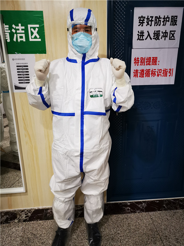 我们看病人及治疗时,都是两个人一起去的。另外,连续工作四到五个小时,穿上防护服一点也不透气,身上总是湿漉漉的,口罩密封得很严密,感觉非常闷,处于轻度缺氧状态,中间不能喝水、上厕所。一个班儿下来,快要虚脱了一样。但我们很快规范了流程,进行了分工,克服了心理恐惧。查看患者、量体温、血氧饱和度、采咽拭子、外出检查CT、治疗等,工作逐渐顺畅起来。