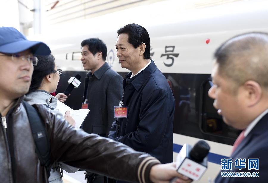 3月1日,来自河南省的全国政协委员抵达北京,出席全国政协十二届三次会议。这是全国政协委员娄源功(中)在接受媒体记者采访。新华社记者 张铎 摄