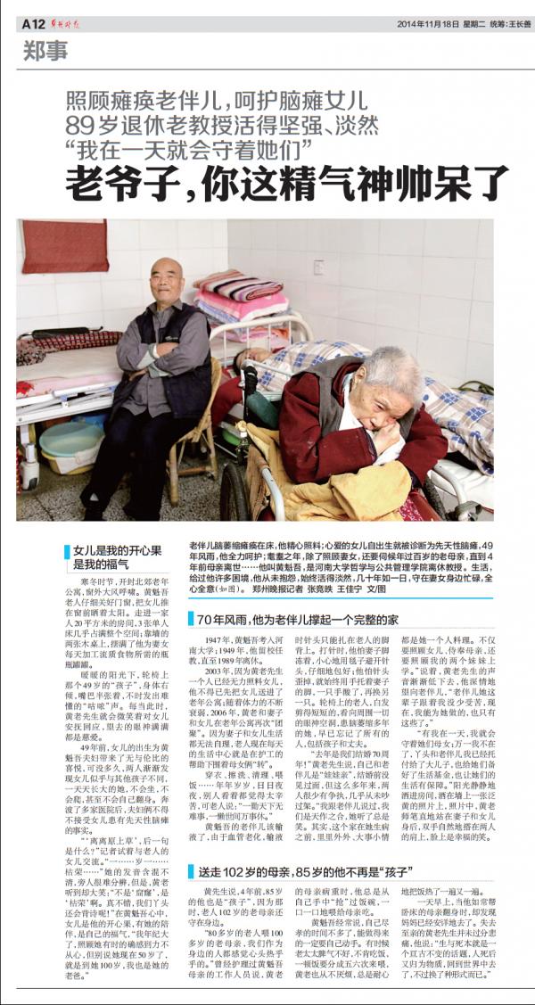 老伴儿脑萎缩瘫痪在床,他精心照料;心爱的女儿自出生就被诊断为先天性脑瘫,49年风雨,他全力呵护;耄耋之年,除了照顾妻女,还要伺候年过百岁的老母亲,直到4年前母亲离世……他叫黄魁吾,是河南大学哲学与公共管理学院离休教授。生活,给过他许多困境,他从未抱怨,始终活得淡然,几十年如一日,守在妻女身边忙碌,全心全意(如图)。