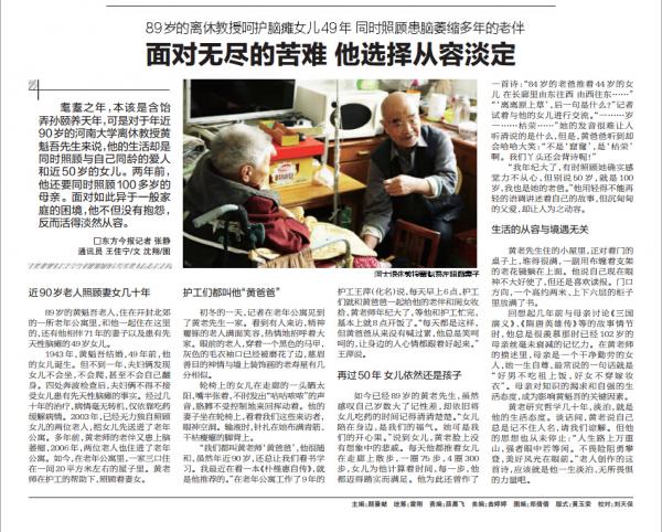 耄耋之年,本该是含饴弄孙颐养天年,可是对于年近90岁的河南大学离休教授黄魁吾先生来说,他的生活却是同时照顾与自己同龄的爱人和近50岁的女儿。两年前,他还要同时照顾100多岁的母亲。面对如此异于一般家庭的困境,他不但没有抱怨,反而活得淡然从容。