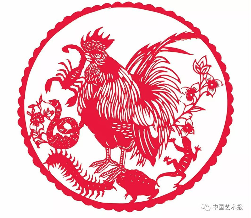 公鸡为五毒之天敌,端午节民间多将剪好的公鸡贴在门窗上驱毒。山西晋北地区端午时节流行家家户户门窗粘贴五色纸符和剪纸公鸡习俗。这些公鸡剪纸多是在正方黄纸上贴以红色剪纸公鸡,一般是以双鸡相向对称而立,嘴里啄食着蝎子,惟妙惟肖,形象生动有趣。公鸡剪纸有时会与“福”“端午吉祥”“恭喜发财”“四季平安”等字样和鱼、灯笼、元宝、铜钱、喜鹊、梅花、艾草、太阳、如意、青蛙等形象一同呈现。甘肃庆阳一带所剪的公鸡嘴上叼着蝎子,而且鸡爪下还踩着鬼头,反映了农民驱毒除恶的心愿。