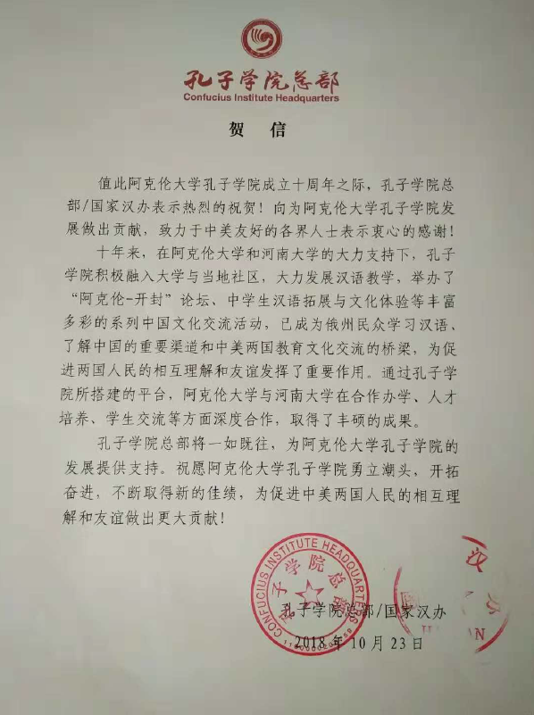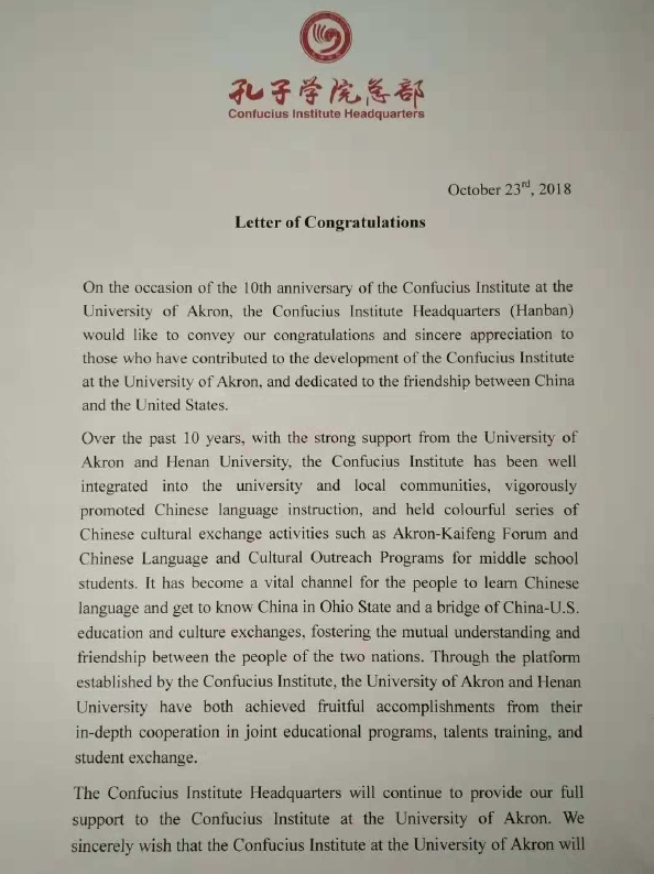 “除了在推广汉语国际交流上,孔院大有作为,在中美青年交流,增进两国经贸、教育、文化交流与合作中,也在发挥着越来越重要的作用。”阿克伦大学孔子学院外方院长林阳教授说,目前,阿克伦大学不仅与河南大学的合作进一步加深,在两校学科间、学者间对接,助推河南大学“一流学科”建设;在孔院的推动下,还促成了阿克伦大学与河南另外2所高校签署了合作协议。