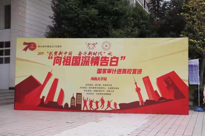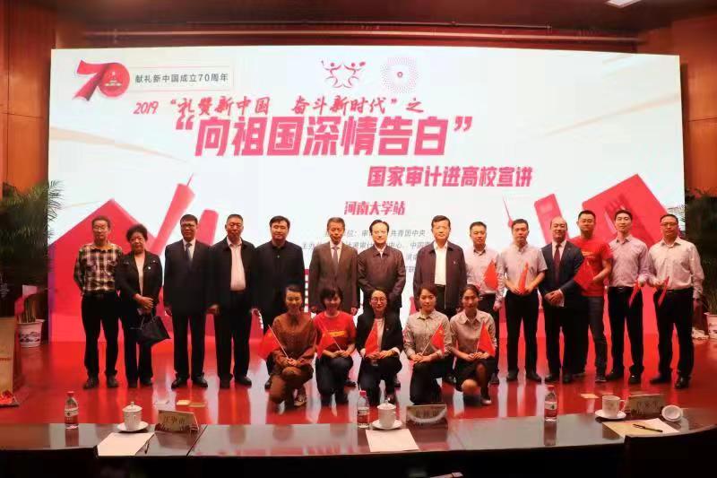 9月19日下午,2019年国家审计走进高校“礼赞新中国 奋斗新时代”主题宣传教育系列活动之“向祖国深情告白”国家审计进高校宣讲活动在我校金明校区计算机大楼二楼报告厅举行。国家审计署、河南省审计厅、河南大学相关领导及河南大学师生代表等参加本次宣讲活动。