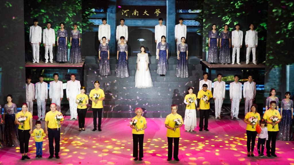 进入第三篇章,一首《相思赋予谁》展现了广大校友对老师和同学的深厚感情。一段充满大学美好回忆的短片过后,来自不同专业,年龄覆盖老、中、青三代人的校友伉俪登上舞台,五对伉俪一一抒发了自己对母校的绵绵“情话”。其中,两位同属1964级外语学院学生的老人最引人瞩目,老先生郑重说出“感恩母校,叩谢师恩”8个字,情之切切,感动全场。百年河大,四载相伴,一声之盟。在温馨热烈的气氛中,集体婚礼告一段落。歌曲《爱在百年》《再过二十年我们来相会》寄托了校友们对未来和母校的无限热忱和期待。随着歌舞《我们都是追梦人》的动感旋律响起,全场观众跟随节拍轻声附和,演出氛围达到最高潮。最后,全体与会人员共同起立齐唱《歌唱祖国》,歌声铿锵,红旗飘扬,大礼堂成了红色与歌声的海洋,几代河大人以这样独特的方式为新中国成立70周年献上礼赞。
