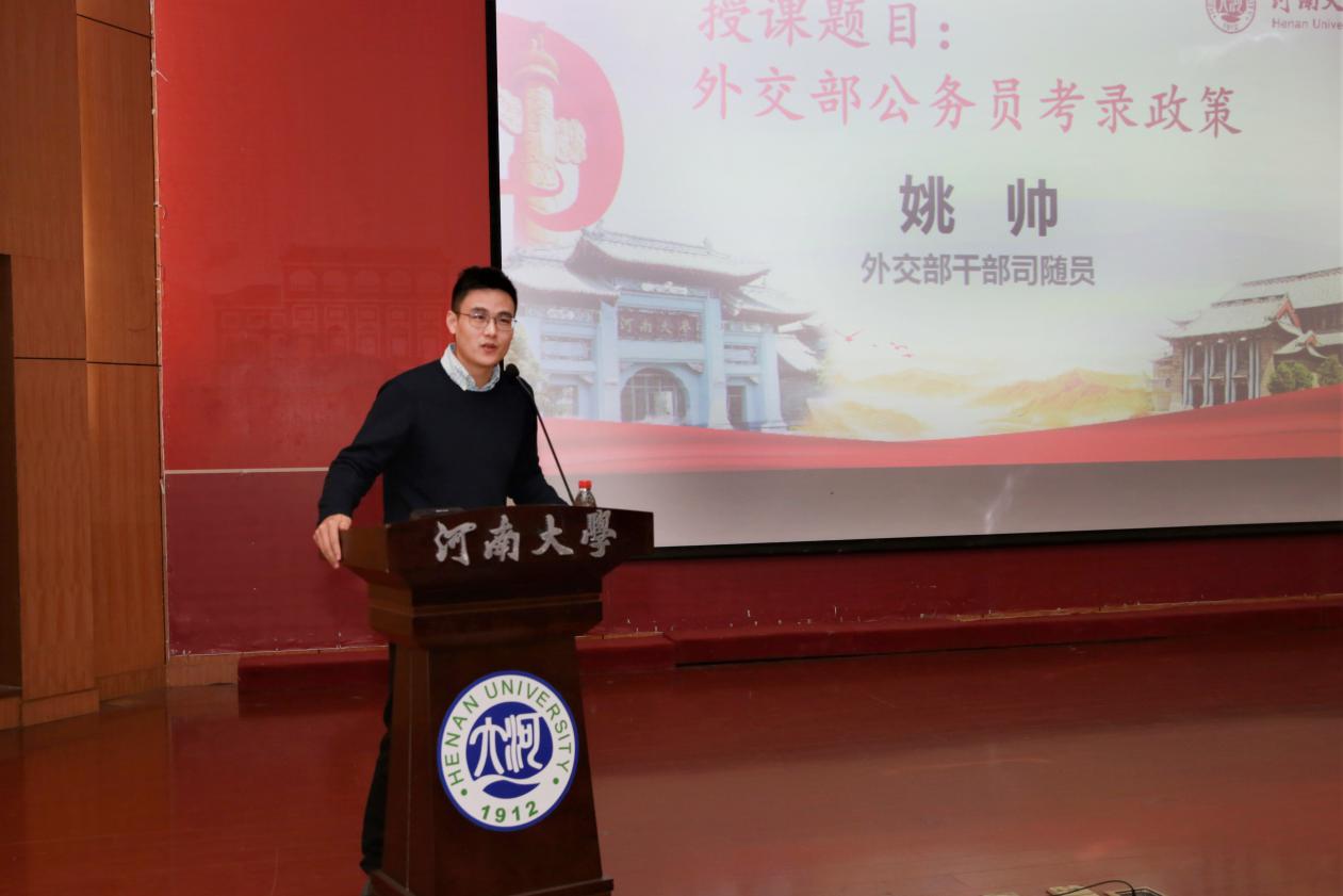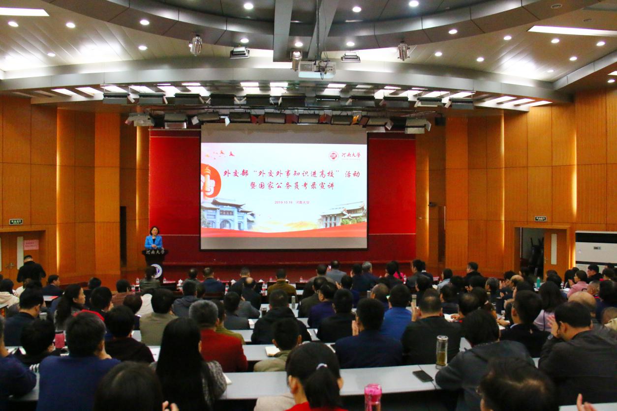 10月16日,外交部“外交外事知识进高校”活动暨国家公务员考录宣讲在我校金明校区计算机报告厅举行。外交部外管司参赞董广利、欧亚司大使、原驻格鲁吉亚、塔吉克斯坦大使岳斌、原驻乌干达、赞比亚大使、驻休斯顿总领事李强民、礼宾司参赞屈浔、领事司参赞蒋薇、外管司副处长张竞、干部司考录培训处随员姚帅、河南省委外办主任付静等与我校500余名师生面对面交流。我校党委常委、副校长孙君健、国际合作与交流处有关负责人出席活动。河南省委外办主任付静主持活动。
