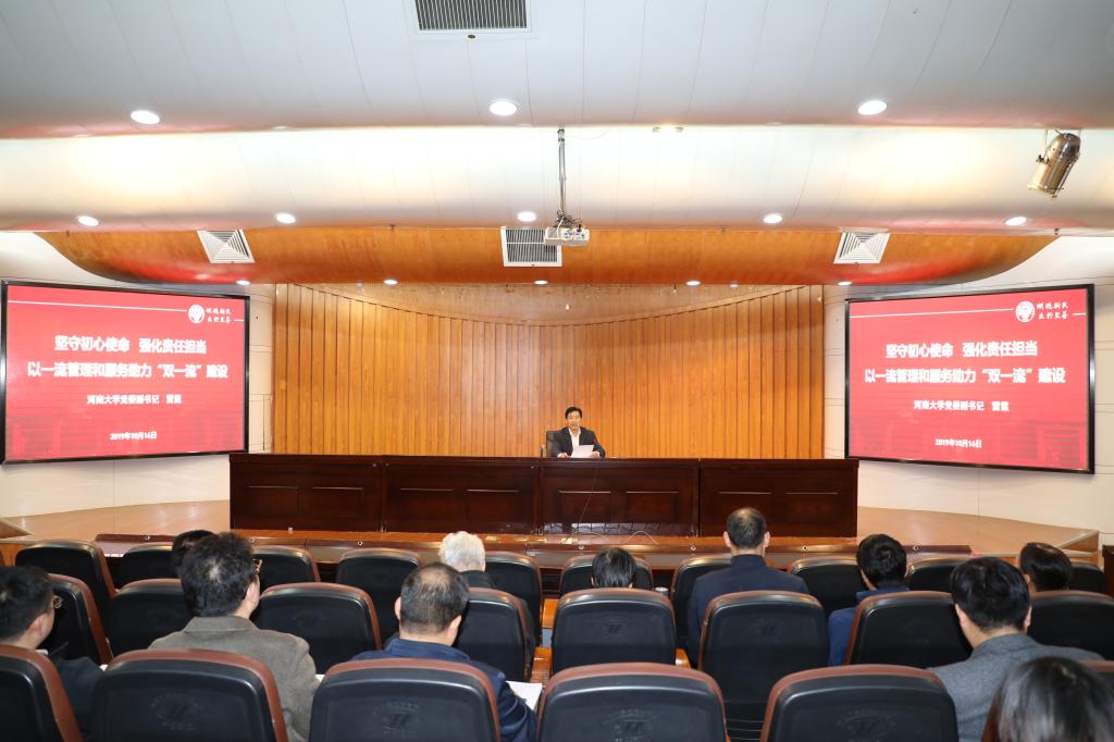 关于河大人的初心和使命,雷霆指出,育人育才、兴学强国是河大人百余年来始终坚守的初心使命。立德树人是我们办学价值的最大体现,也是我们必须承担的核心使命。建设“双一流”是我们贯彻落实党中央和国务院战略决策的重大举措,是实现新时代中原更加出彩的内在要求,是学校实现百年名校振兴的最佳途径,也是河大人的重大使命。