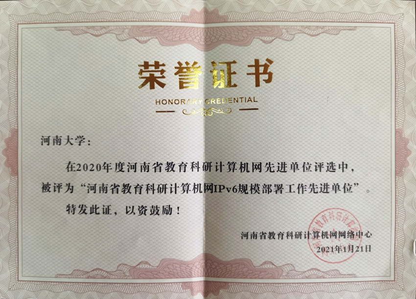 近日,中共河南省委高校工委、河南省教育厅下发《关于表彰2020年度全省教育系统网络安全和信息化工作先进集体先进个人的决定》(教科技〔2021〕57号),我校被评为2020年度全省教育系统网络安全和信息化工作先进集体;省网办下发《关于公布河南省教育科研计算机网2020年度优秀城市节点与IPv6规模部署工作先进单位的通知》(省网办〔2021〕3号),我校被评为“河南省教育科研计算机网2020年度优秀城市节点”和“河南省教育科研计算机网IPv6规模部署工作先进单位”。