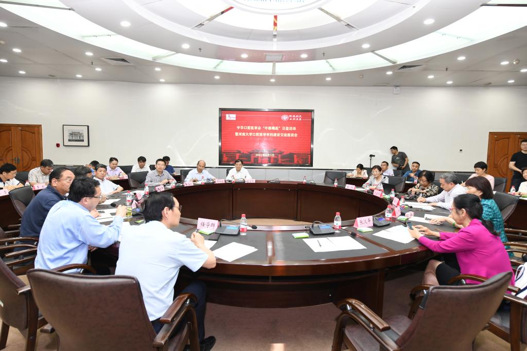 下午五点半,河南大学校长宋纯鹏教授,副校长、医学院党委书记孙君键教授接见了王松灵院士等各位专家学者,并在金明校区行政楼152会议室举行了“中华口腔医学会‘中部崛起’公益活动暨河南大学口腔医学学科建设交流座谈会”。医学院、基础医学院、淮河医院、第一附属医院、口腔医学院和赛思口腔医院的负责同志参加了座谈会。座谈会由口腔医学院任延方院长主持。任延方院长首先代表学院向与会领导和专家表示诚挚欢迎,并向来宾们介绍了学院发展的概况;王松灵院士就我国口腔医学发展和口腔医学教育的历史和现状作了详细解读,并对我校口腔医学学科建设和发展提出了建设性意见;中华口腔医学会秘书长、副秘书长就“中部崛起”活动的初心和任务进行了介绍,曹选平会长结合河南省口腔医学的发展做了发言。其他与会专家也踊跃建言,进行了充分的讨论和交流。最后,宋纯鹏校长作了总结讲话,他表示,本次中华口腔医学会来河南大学举办“口腔健康促进与口腔医学发展中部崛起”公益活动教学帮扶,既是落实国家全民健康的战略需要,也是关心关注民生的贴心举措,更将是河南口腔医学发展的一个重要契机,河南大学一定会抓好机遇,在“双一流”建设征程中,争取在口腔医学人才培养、科学研究和服务人民群众健康等方面做出更大的贡献。