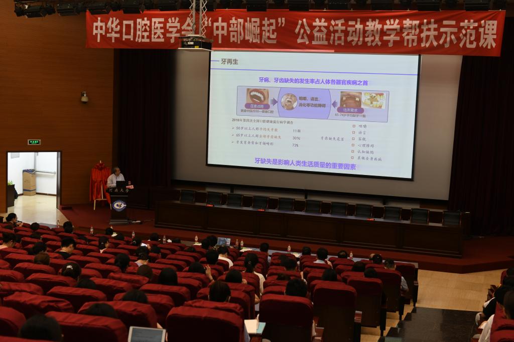 为进一步提升教师队伍整体素质,提高教学水平和教育教学质量,6月3日上午8点,中华口腔医学会“中部崛起”公益活动教学帮扶示范课开班仪式在河南大学金明校区图书馆一楼报告厅举行。开班仪式由医学院常务副院长任学群主持。校党委常委、副校长、医学院党委书记孙君健致辞,向与会专家们介绍了河南大学办学历史、医学教育发展情况、口腔医学专业发展历程等。他表示,河南省口腔医学有悠久的发展历史,现阶段是河南省口腔医学事业发展最好的时期,希望通过“口腔健康促进与口腔医学发展中部崛起”这项公益活动,更加关注中部地区口腔医学的发展,投入更多的资源和精力,帮助、扶植、带动中部口腔医学的崛起。之后,河南省口腔医学会会长曹选平介绍了河南省口腔医学发展现状、河南省口腔医学会基本情况,分析了河南口腔医学教育存在的问题、面临的形势和任务。在开班仪式上,中华口腔医学会秘书长、北京大学口腔医学院岳林教授代表中华口腔医学会对上海博恩登特科技有限公司在我国口腔医学教育和公益活动中的支持与帮助表示感谢,并为陈春宏总裁颁发了感谢状。最后,会议还举行了中华口腔医学会“中部崛起”公益活动河南大学口腔医学院继续教育基地揭牌仪式。由中华口腔医学会副会长王松灵院士、岳林秘书长和河南省口腔医学会曹选平会长、河南大学口腔医学院院长任延方院长进行了揭牌。