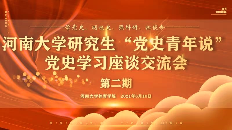 6月10日下午,由河南大学研究生会主办,体育学院研究生会承办的河南大学研究生“党史青年说”党史学习座谈交流会第二期会议在体育学院科研中心一楼顺利开展。学院邀请了校党委研究生工作部副部长刘婷、体育学院党委书记牛娴、党委副书记王建国、副院长周珂等出席座谈会,来自我校十个院系和一个校级学生组织的研究生代表参与了分享交流,会议由体育学院研究生会主席团成员刘禹主持。
