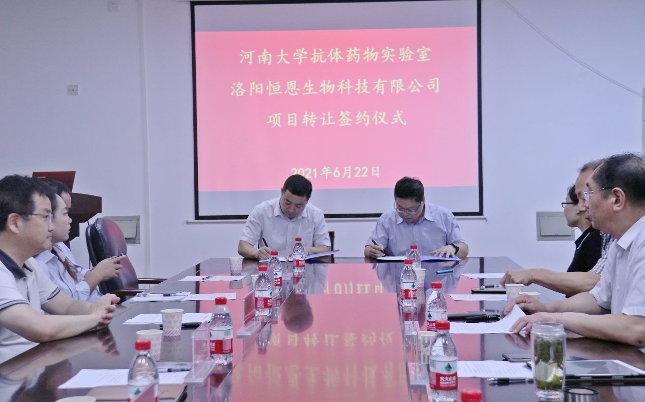 基础医学院抗体药物开发技术国家地方联合工程实验室马远方课题组新冠病毒中和抗体检测相关技术成功转让洛阳恒恩生物科技有限公司。6月22日,科研成果转让签约仪式在会议室举行。校党委常委、副校长、医学院党委书记孙君健,科学技术研究院有关负责人,实验室班子成员,项目组成员,师生代表出席签约仪式。仪式由实验室主任李霞主持。