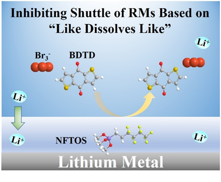 基于相似相溶原理构建了氟硅烷(下层)和醚(上层)两相电解液,抑制了RMs穿梭效应的示意图