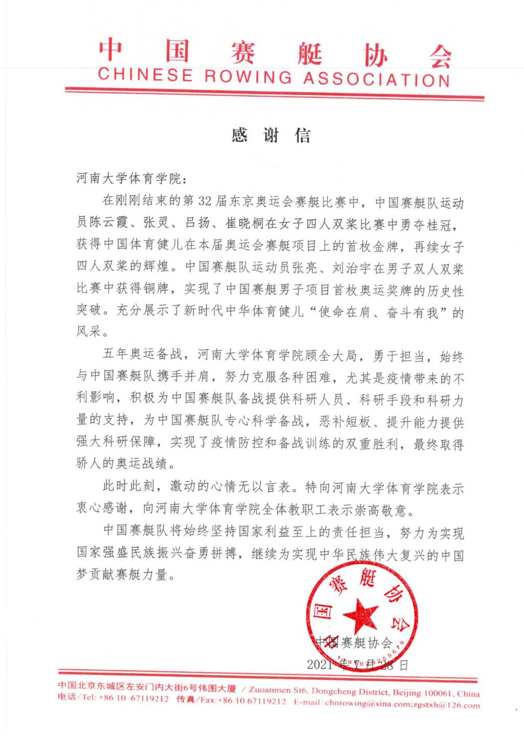 赛后,中国赛艇协会向我校体育学院发来感谢信。对学院在五年东京奥运备战期间为中国赛艇队提供的科研人员、科研手段和科研力量支持以及为中国赛艇队专心科学备战,恶补短板、提升能力提供的强大科研保障,表示衷心感谢和崇高敬意!