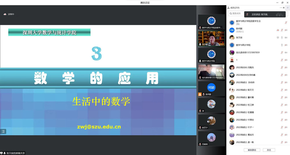 随后,河南大学83届优秀校友,深圳大学张文俊教授通过线上的方式给同学们作题目为“例谈数学的智趣用”的趣味科普报告。他通过常见的抽奖问题、约会问题、选举问题、猜心术等9个生活、管理、魔术案例,给同学们讲解了其背后的数学智慧、趣味和应用价值。他的讲座有观点、有案例、有解析,漫谈但不失严谨,通俗却不免深刻,科学又不乏趣味,同学们听得津津有味,兴趣盎然。