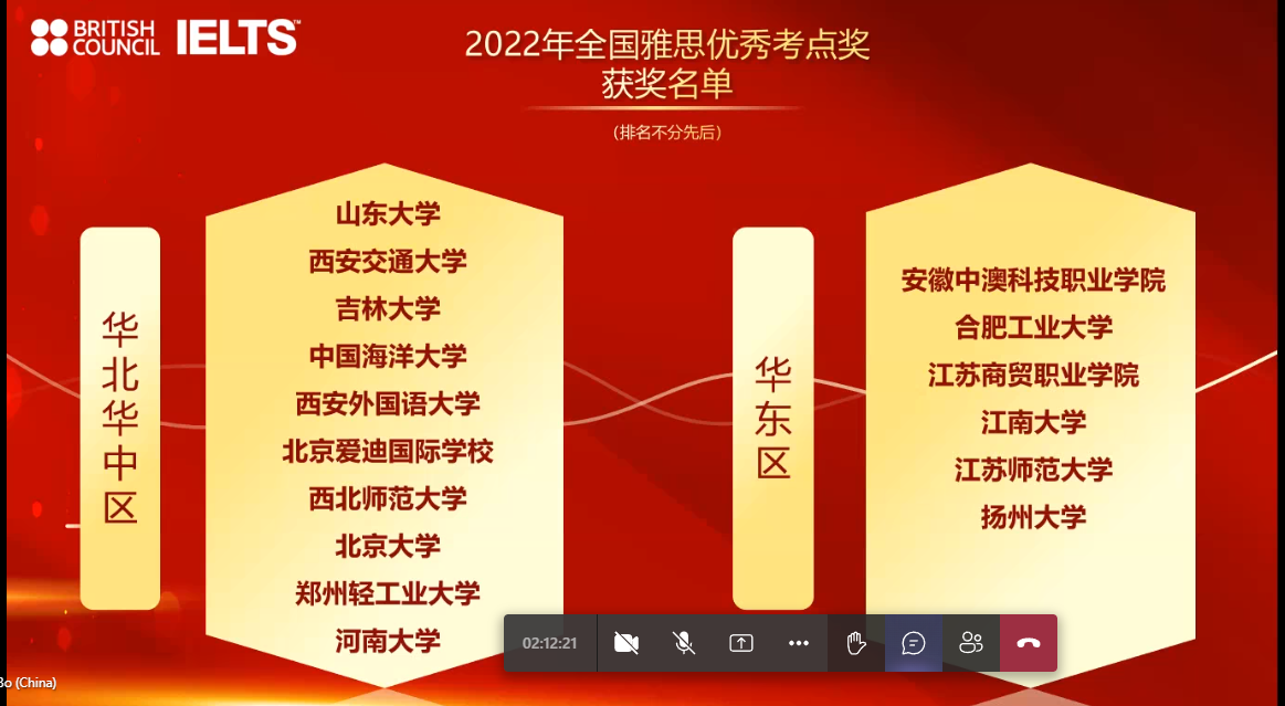 12月1日上午,2022年全国雅思考点线上工作会议顺利召开,河南大学雅思机考考点从100多个考点中脱颖而出,被授予“2022年度全国雅思优秀考点奖”。此奖项是教育部教育考试院和英国文化教育协会(BC)对河南大学雅思考点建设与工作表现的高度认可和赞誉。