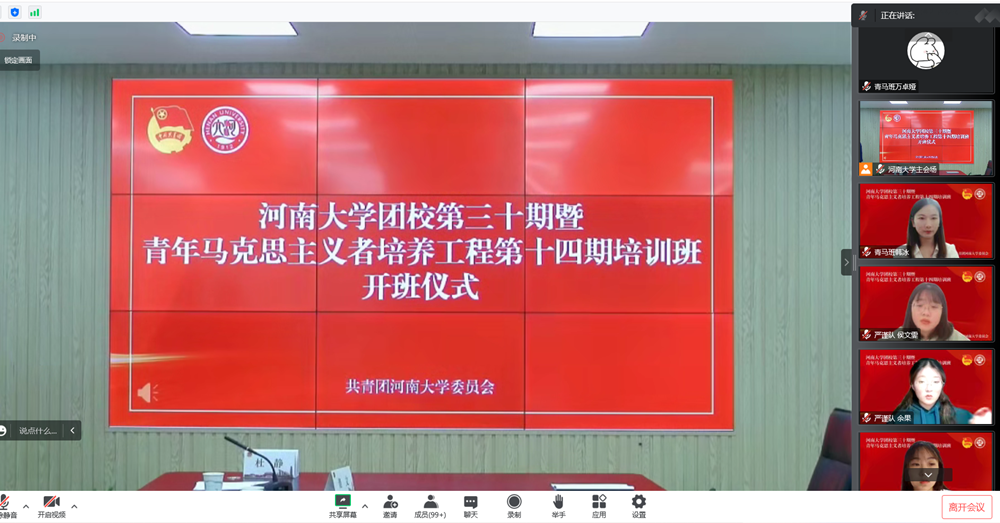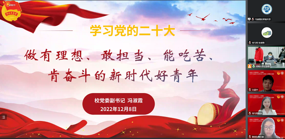 12月8日下午,河南大学团校第三十期暨青年马克思主义者培养工程第十四期培训班开班仪式在金明校区举行。校党委副书记冯淑霞出席仪式并讲话,校党委宣传部、学生工作部、研究生工作部以及校团委等有关职能部门负责人与会,各学院团委负责同志、团校和“青马班”全体学员线上参会。开班仪式由校团委副书记董文主持。