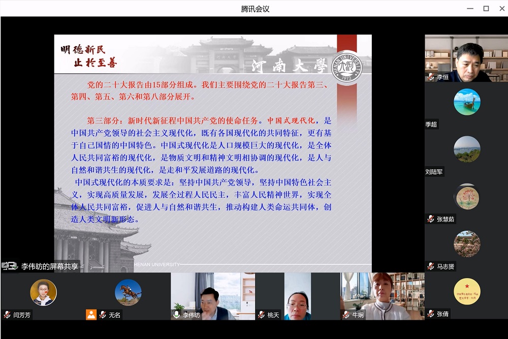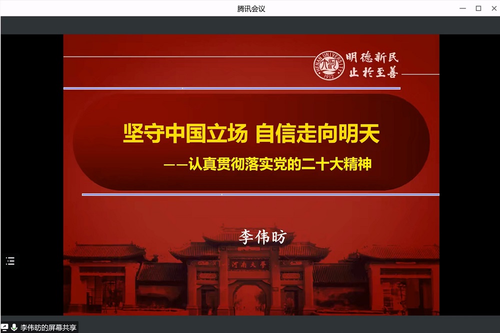 12月16日上午,按照学校党委统一部署,学校党的二十大精神理论宣讲团成员李伟昉教授为图书馆全体职工作《坚守中国立场,自信走向明天——认真贯彻落实党的二十大精神》专题报告。会议以腾讯会议方式进行,图书馆全体职工线上参会。图书馆党委书记牛娴主持报告会。
