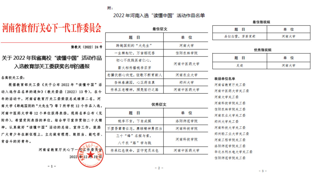近日,教育部关工委《关于公布2022年“读懂中国”活动入选作品名单的通知》(教关委函〔2022〕13号)公布,我校选送的作品榜上有名。我校外语学院以采访华籍美人吴雪莉先生的《跨越国别的“大先生”》《品似白雪,芳若茉莉》分获荣获最佳征文奖与最佳微视频奖,均入选中国教育电视台“读懂中国”活动优秀作品展播。新闻与传播学院报送作品《足迹》荣获优秀微视频奖。我校获评教育部关工委2022年“读懂中国”活动表扬单位,获评作品数量与质量均名列省内高校前茅。