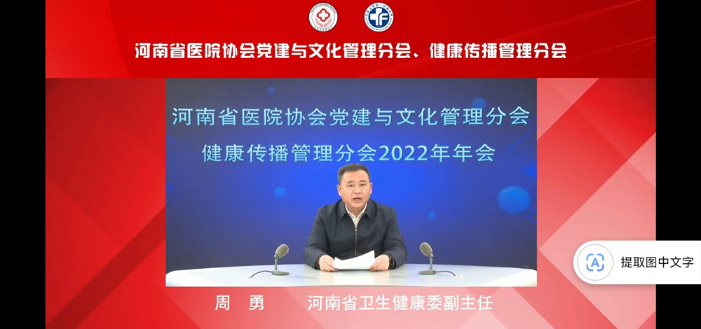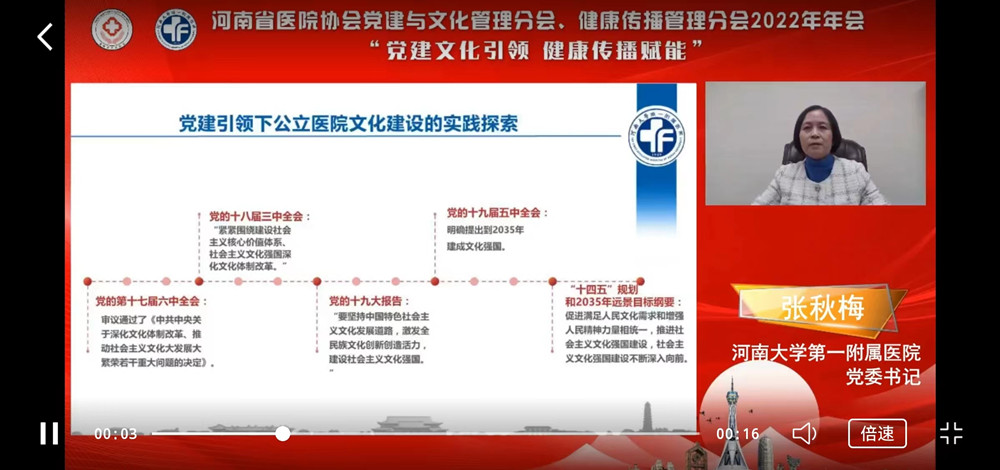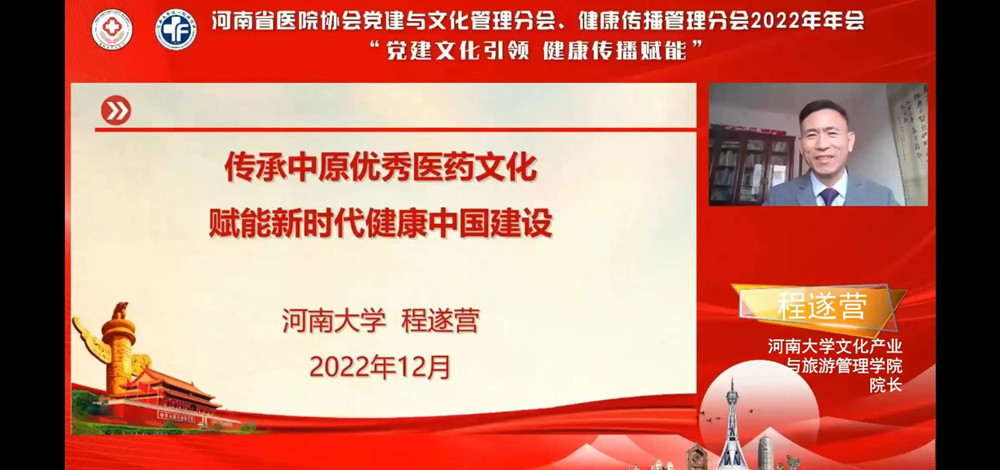 12月23日,由河南省医院协会主办,河南大学第一附属医院承办的河南省医院协会党建与文化管理分会、健康传播管理分会2022年年会,以线上形式召开,来自全省各级医疗机构的领导、专家齐聚云端,共同探讨新时期加强医院党建与文化管理、健康传播工作的新思路、新策略、新路径,凝聚共识、共谋发展。