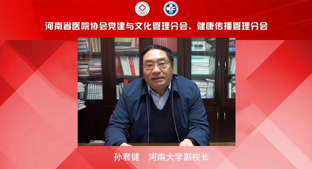 孙君健代表河南大学,向线上参会的各位同道同仁表示热烈的欢迎!他表示,党的二十大为未来的文化建设发展指明了方向。文化建设对高质量发展有着重要的意义。希望与会同仁,以党的二十大精神为引领,进一步凝聚医务工作者全心全意为人民服务的共识,筑牢初心使命,提质医院文化建设,创新开展健康传播,奏响河南医疗卫生行业党建与文化建设高质量发展的最强音,为推进健康中国建设、护佑人民生命健康作出新的更大的贡献!