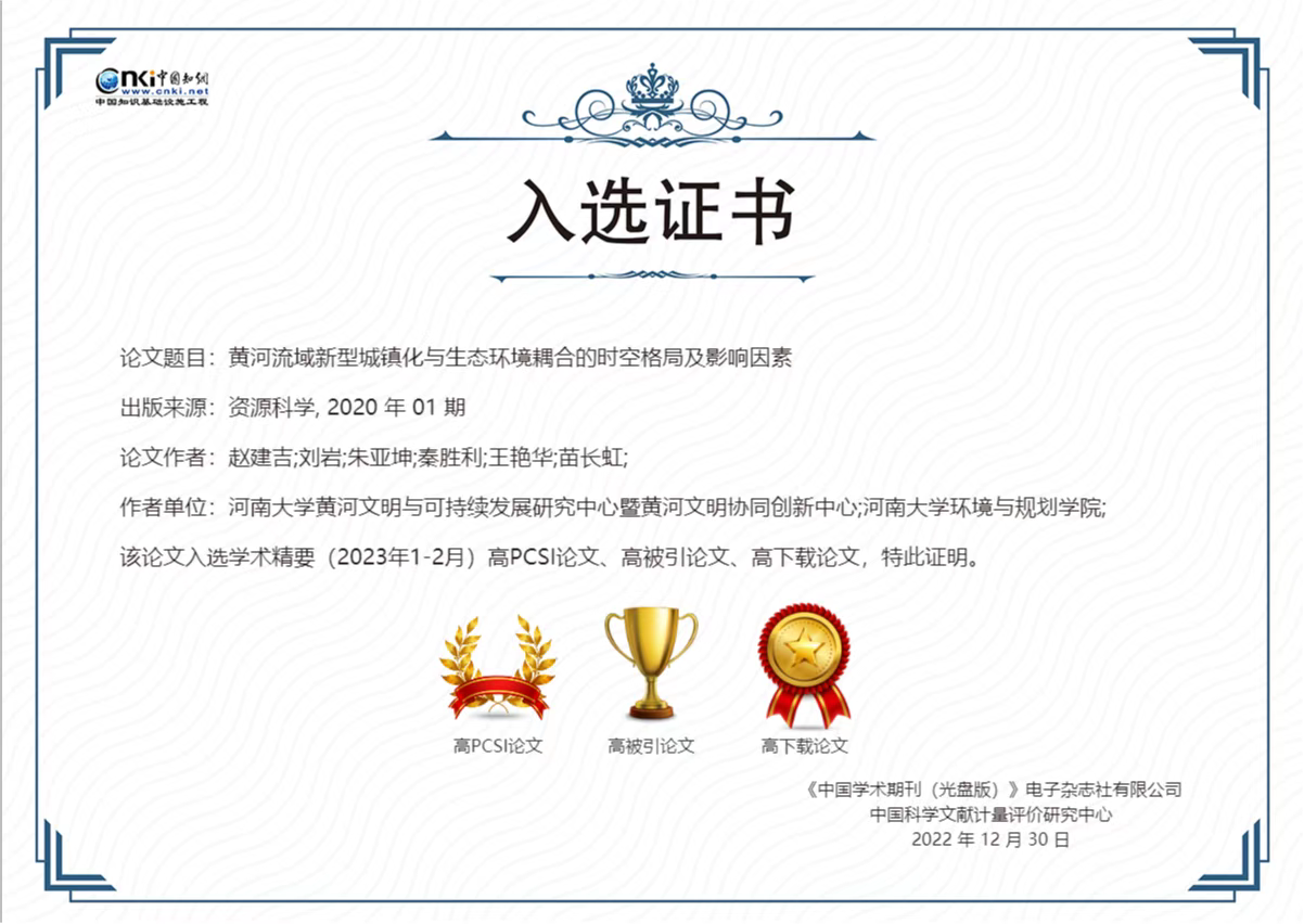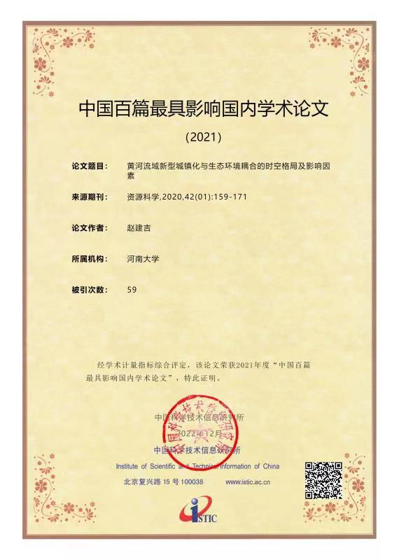 2022年12月29日,中国科学技术信息研究所线上举办本年度“中国科技论文统计报告发布会”,报告公布了本年度中国百篇最具影响国际(国内)学术论文。黄河文明与可持续发展研究中心暨黄河文明协同创新中心赵建吉教授团队发表在《资源科学》2021年第42卷第1期上的论文《黄河流域新型城镇化与生态环境耦合的时空格局及影响因素》入选2021年中国百篇最具影响国内学术论文。