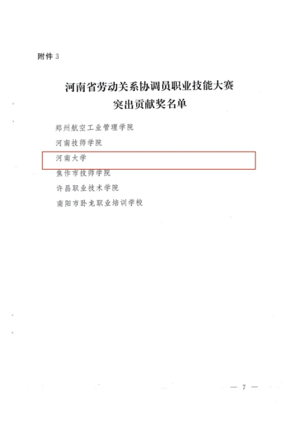 日前,河南省人力资源与社会保障厅公布了“河南省劳动关系协调员职业技能大赛”全省决赛获奖名单(豫人社函【2022】356号)。哲学与公共管理学院劳动与社会保障本科专业2019级学生刘珂欣、张瑞敏和2020级学生赵艺哲获大赛学生组一等奖(全省学生组一等奖获奖人数仅4人),占全省学生组获奖总数的75%。2019级王振东获省级二等奖(全省学生组二等奖获奖人数仅5人)。河南大学获突出贡献奖。