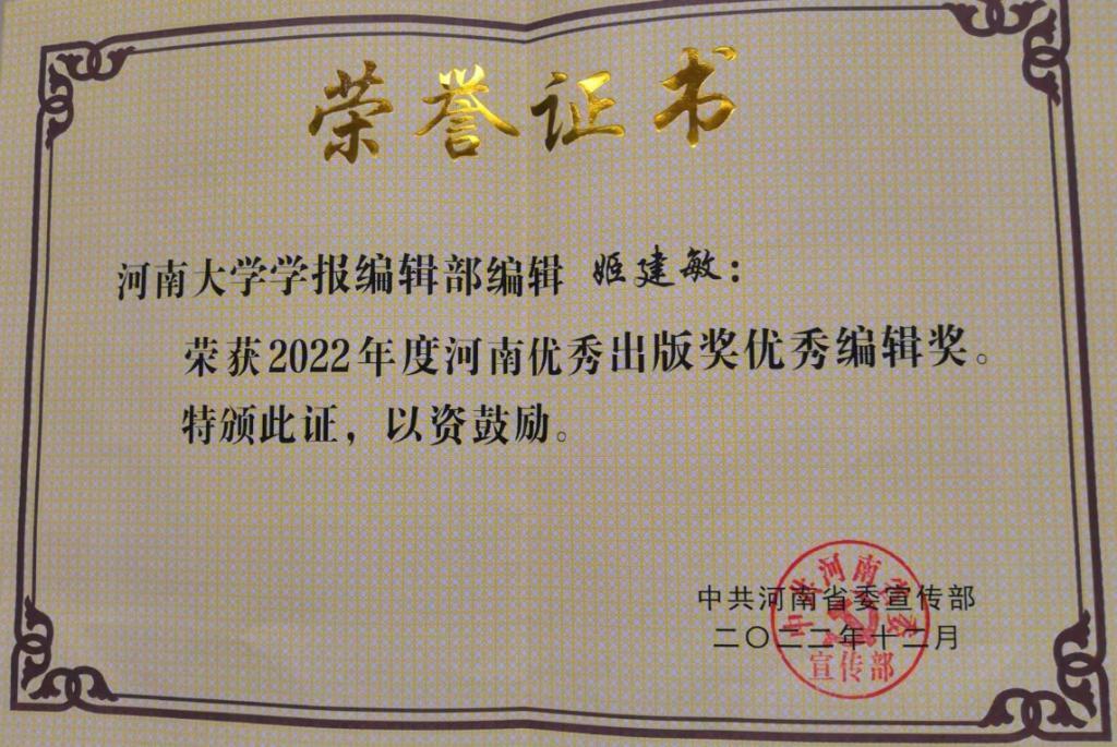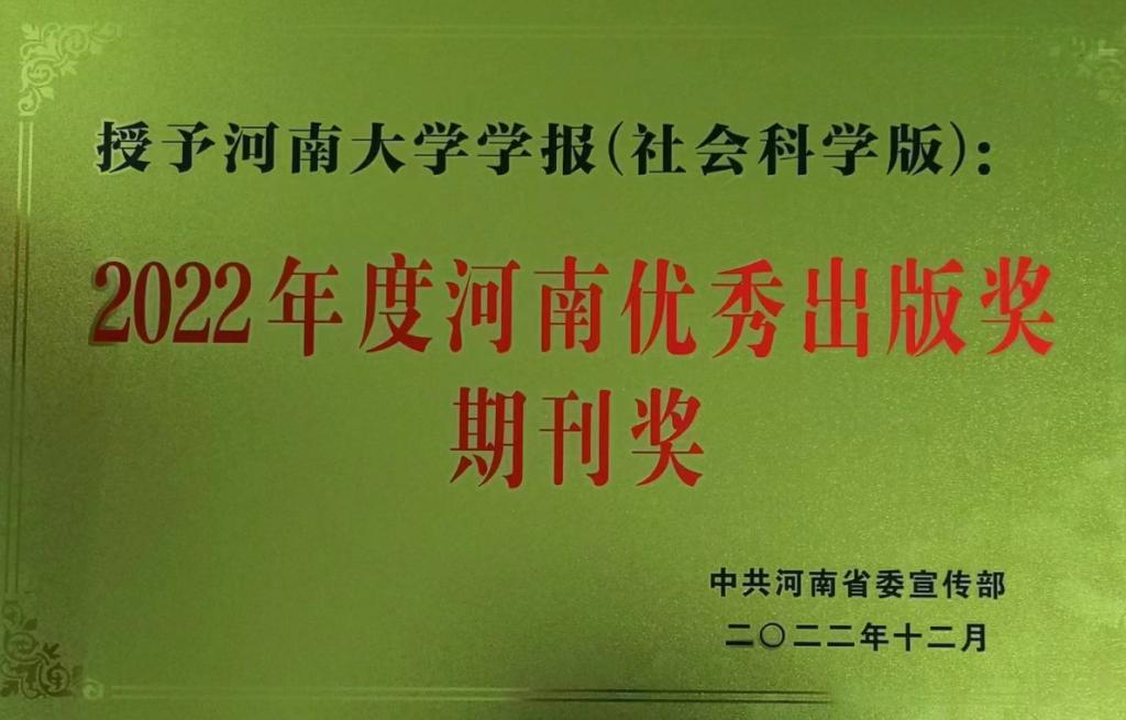 《河南大学学报(社会科学版)》获得“2022年度河南优秀出版奖期刊奖”,编辑部姬建敏教授获得“2022年度河南优秀出版奖优秀编辑奖”。