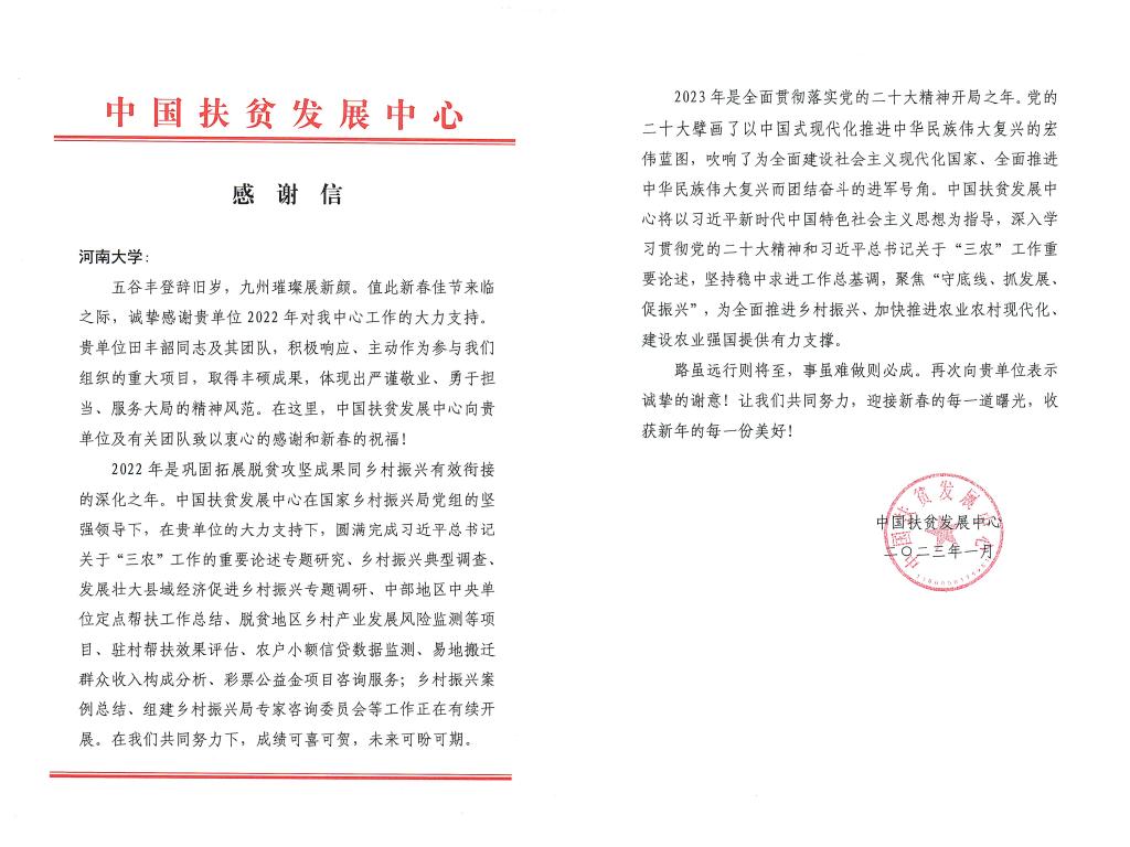 信中写道,2022年是巩固拓展脱贫攻坚成果同乡村振兴有效衔接的深化之年。中国扶贫发展中心圆满完成了习近平总书记关于“三农”工作重要论述专题研究、乡村振兴典型调查、中部地区中央单位定点帮扶工作总结、驻村帮扶评估等工作。田丰韶团队表现出了严谨敬业、勇于担当、服务大局的精神风范。据悉,哲学与公共管理学院田丰韶团队在2022年承担并高质量完成了最高人民法院、工信部、教育部等七家中央单位对河南、安徽两省七县的定点帮扶工作。同时在中国扶贫发展中心组织下,圆满地完成了河南省驻村帮扶评估工作。