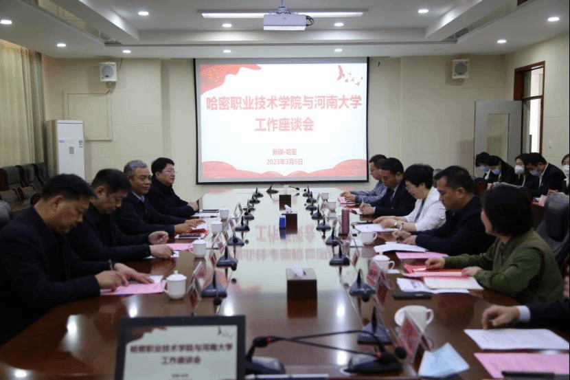 双方在博实楼2号会议室进行座谈。王瑞生介绍了哈密职业技术学院的发展历程以及学校目前的办学情况,表示一定会继续加强跟河南大学的深入合作,继续深入推进职业教育发展。