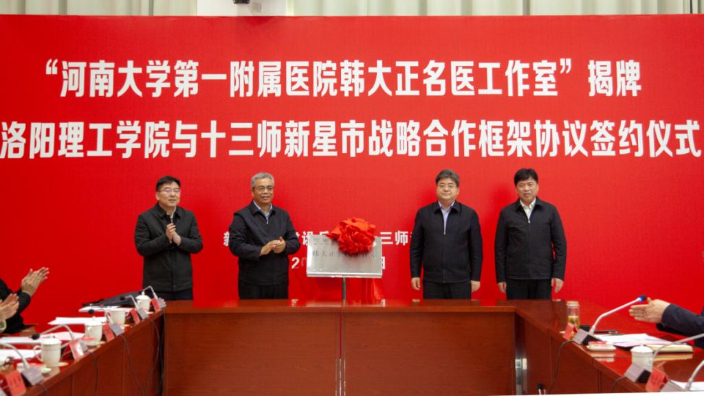 杨宏斌与卢克平共同为“河南大学第一附属医院韩大正名医工作室”揭牌,潘朝印与曾涛分别代表师市与洛阳理工学院签约。