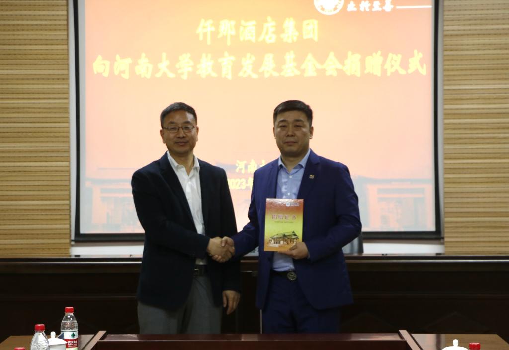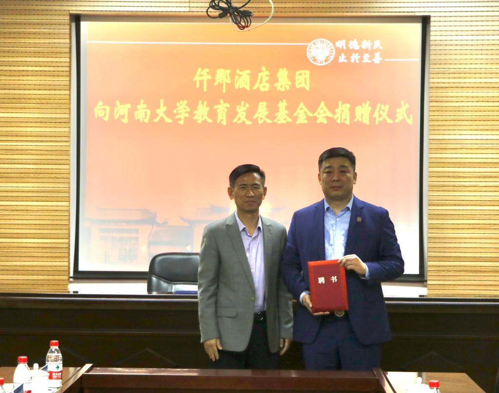 仪式上,文化旅游学院院长程遂营向仟那实业集团董事长、仟那酒店集团创始人陈坤峰颁发河南大学文化旅游学院兼职教授证书。河南大学教育发展基金会秘书长刘波与捐赠方签订捐赠协议,并代表学校接受捐赠。王学路向捐赠方代表仟那实业集团董事长、仟那酒店集团创始人陈坤峰颁发捐赠证书和纪念杯。