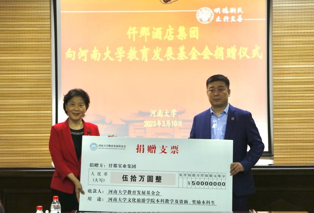 王学路代表学校师生向仟那酒店集团的捐赠表示感谢。他向来宾介绍了近几年学校的发展情况,指出学校一直以来高度重视文化旅游学院的发展,2023年是旅游管理专业成立30周年,希望文化旅游学院充分利用这一重大发展机遇,自觉对接战略方向,紧密把握产业发展的内在要求,顺应并融入重大部署,持续产出高质量学术成果,培养更多优秀人才,积极参与到蓬勃发展的产业与事业中去。此次仟那酒店集团捐赠50万元用于学院本科生教学和学生奖励基金,充分体现了集团的社会责任和担当,希望学院可以用好这笔基金,为河南省文旅产业发展和河南大学“双一流”建设贡献力量。
