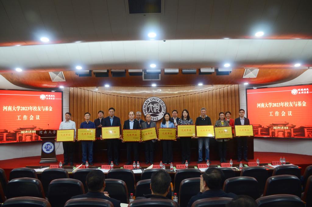 土木建筑学院、商学院、文学院、物理与电子学院、外语学院、武术学院、药学院、数学与统计学院、法学院(知识产权学院)、软件学院等10个单位获得2022年度校友与基金工作先进单位,与会领导为受表彰的单位代表颁奖。