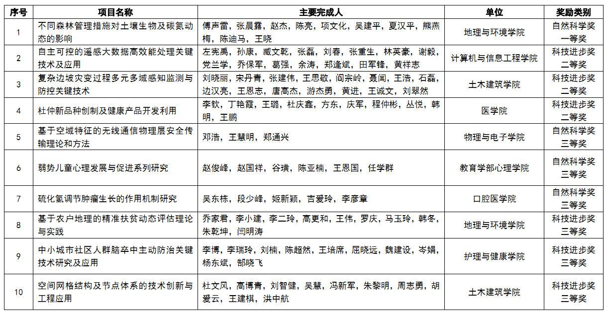 近日,河南省人民政府公布了2022年度河南省科学技术奖励名单,我校再创佳绩,共荣获河南省科学技术奖10项,以第一完成单位获得一等奖1项,二等奖3项,三等奖6项。