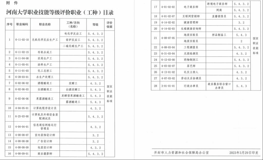 据悉,3月29日,开封市人力资源和社会保障局给我校发来《关于同意河南大学社会培训评价组织备案的函》。此次通过的社会培训评价组织备案申请职业(工种)包括化工总控工、白酒酿造工、室内装饰设计师、电子商务师、茶艺师、劳动关系协调员等28个工种。这是我校在职业教育领域的新突破,学校将以此为契机,充分发挥“双一流”高校办学优势,积极开展职业技能社会培训认定工作,为服务区域经济发展培养更多优秀的技能人才。